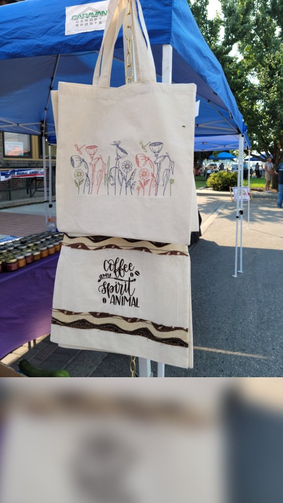 That first week I sold two shopping bags, one embroidered with a wild flower border, and the other with “Coffee is my Spirit Animal”. I had fun making those bags. I split the sides to make them fit on my embroidery machine, then sewed them back up when I was done. I was inspired to add a strip of coordinating fabric to each when I was sewing them back up, and they turned out great. The other two bags were a patriotic American flag with the Pledge of Allegiance making up the red stripes on one, and a cute set of fishing lures done with a bean stitch on the other.